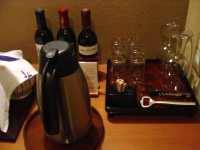つも熱い湯が用意され、別のポットには冷水も準備。冷蔵庫の品揃えもまずまずで、常温のワインが3