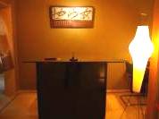結城畳が美しい玄関ロビー 左手の衝立が魯山人の絵 「あらや」の看板も魯山人の篆刻作品