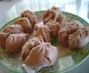 竹の棒状のものにこれを巻いてドリアンソースにかけて食べる。食べても少ない湯で溶いた硬めの葛