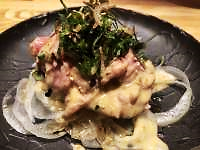 遅い夜 博多「博多ふじ本」付き出し:ピーナッツ豆腐・ササミとクラゲのマヨネーズ和え、唐津