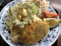 昼 由布院「陽だまり食堂」陽だまり定食(とり天、ゴーヤなど野菜天、牛蒡コロッケ、生野菜、だんご
