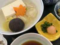朝 明石町「ダイニング」A定食(湯豆腐、ししゃも焼き物、うぐいす豆、ご飯、ニラ玉汁、飲むヨーグル